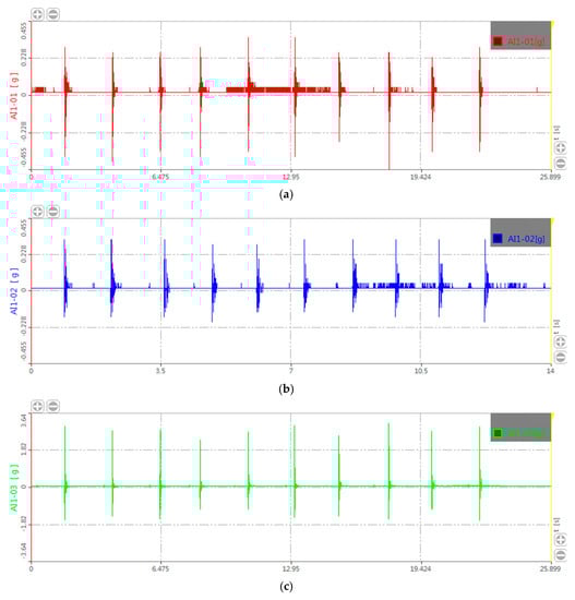 Measured acceleration wave curves. (a) Acceleration of the X-direction; (b) Acceleration of the Y-direction; (c) Acceleration of the Z-direction.