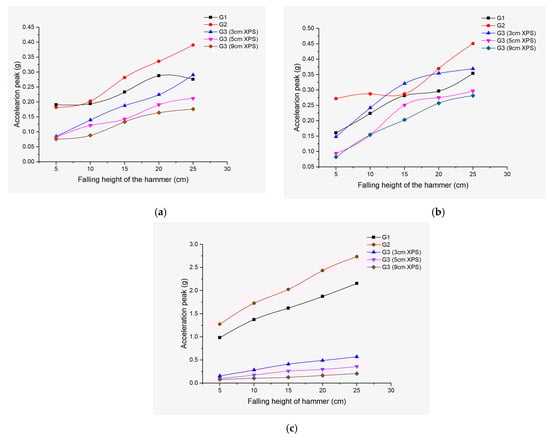 From Figure 5, the acceleration peak values in the three main axes (X, Y, and Z-direction) for G1, G2, and G3 embedding different thicknesses of XPS plates rose as the falling heights increased. Comparing the data of G1 to G2, the acceleration peak values of G1 were lower than that of G2, especially in the Z-direction. This means that the vibration isolation performance of the modified soil was worse than that of silty clay. The reason for this phenomenon is that fly ash reduces the damping of improved soil [22], while rubber particles increase the damping of modified soil. The strengthening effect of 2% rubber particles is very limited. The 32% content of fly ash dominates the change of damping of modified soil, which leads to the phenomenon that the damping of modified soil is less than that of silty clay and the vibration amplitude of modified soil is larger than that of silty clay. Thus, it is necessary to improve the vibration isolation performance of the modified soil subgrade.