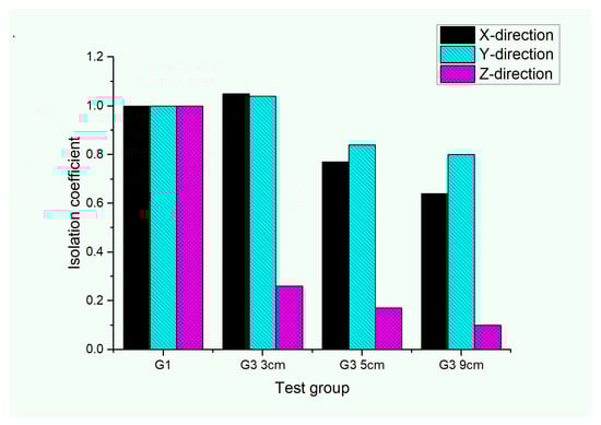 The main reason for road diseases in seasonally frozen areas is that the stability and durability of the subgrade material decreases after freeze–thaw cycles, which results in the increase of soil subsidence deformation and uneven sinking of the road. It is necessary to ensure the anti-freeze–thaw performance of the composite subgrade structure in seasonally frozen areas. The acceleration peak value of the composite subgrade structure embedding 5 cm XPS plates after 1, 2, 3, 4, and 5 freeze–thaw cycles were measured. The vibration isolation analyses in the three main axes were conducted as well as the comparative analysis with G1 and G2. The results are demonstrated in Figure 9.