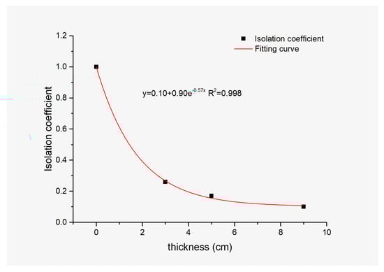 From Figure 6, the isolation coefficient of the composite subgrade structure decreased as the thickness of the XPS plates increased. For G3, which embeds XPS plates with the thickness of 9 cm, the isolation coefficient C in the three main axes were 0.64, 0.80, and 0.10, respectively. The vibration isolation effect in the Z-direction was more significant than that in the other two directions. It should be noted that the C value in the X-direction and Y-direction for G3 embedding with 3 cm XPS plates was greater than for G1. This means that the vibration isolation in transverse performs a negative effect when compared to G1. However, the vibration isolation effect in the Z-direction of the composite subgrade structure is the most concerning problem. The relationship between the isolation coefficient in the Z-direction and the thickness of XPS plates is fitted in the exponential form, which is demonstrated in Figure 7.