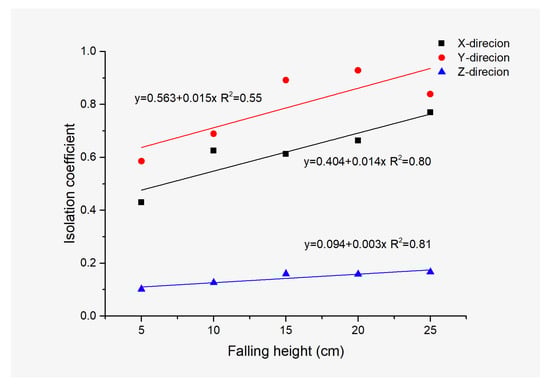 Figure 8 shows that the isolation coefficient of the composite subgrade structure increased as the falling height increased. To master the characteristics of the isolation coefficient with the change in vibration intensity, the test data were fitted in linear forms, which are demonstrated in Figure 8. From Figure 8, it can be seen that the correlation coefficients of the X-direction and Y-direction were stronger than that of the Z-direction. The slope value represents the decay rates of the isolation coefficient with the increase in vibration intensity. The slope of the X-direction, Y-direction, and Z-direction were 0.014, 0.015, and 0.03, respectively. The decay rate of the isolation coefficient in the Z-direction was the lowest, which means that the vibration isolation effect in the most concerned Z-direction has the smallest change with the increase in vibration intensity, showing good vibration isolation stability. Specifically, the vibration isolation coefficient increased by 62.7% (from 0.102 to 0.166) while the load intensity increased by 400% (from 5 cm to 25 cm). The vibration isolation effect of the X-direction and Y-direction varied greatly with the increase in the vibration intensity. However, the vibration amplitude of the X-direction and Y-direction was far less than that of the Z-direction when the XPS plates were not set. In addition, the vibration isolation coefficients were all less than 1 in this study, which means that the vibration intensity of the XPS plate structure was less than that of the unset structure, so the vibration influence in the X-direction and Y-direction is very limited. When the falling height of the hammer was 25 cm, the isolation coefficient in the Z-direction was 0.166, which was still lower than 0.2. Thus, it can be concluded that the composite subgrade structure possessed great vibration isolation performance in the Z-direction, even under great intensity vibration.