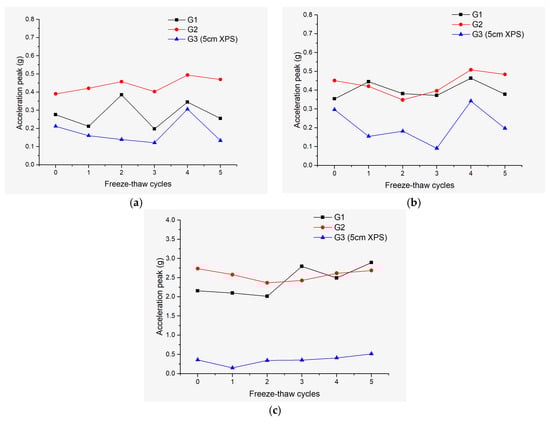 Acceleration peak of the three test groups after freeze–thaw cycles. (a) Acceleration peak in the X-direction; (b) Acceleration peak in the Y-direction; (c) Acceleration peak in the Z-direction.