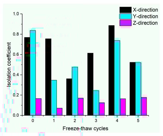From the above results, it can be concluded that the vibration isolation of the composite subgrade structure after several freeze–thaw cycles was still significant, especially in the Z-direction. The isolation coefficients of the composite subgrade structure after the freeze–thaw cycles are described in Figure 10. The isolation coefficients in the X-direction and Y-direction fluctuated drastically, while the isolation coefficient in the Z-direction maintained relatively stable. The isolation coefficients in the Z-direction of the composite subgrade structure were all lower than 0.2, which reflects its great anti-freeze–thaw stability in terms of vibration isolation performance.