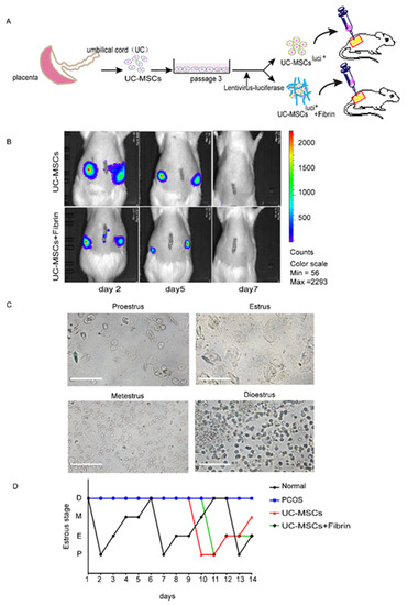 A group of 21-day-old female rats (n = 15) was injected with testosterone propionate (10 mg/kg body weight) continuously for 35 days, whereas another group (n = 5) was injected with the same dose of sesame oil and designated as the control group. After 35 days, the estrous period of the rats was detected by observing the vaginal smears under a light microscope without staining [54]. The rats that remained in the diestrum were designated as a model for PCOS, and were further divided into three groups, including the PCOS group (n = 5), UC-MSCs group after intraovarian injection of UC-MSCs (1 × 106 before 5th passage) labeled with luciferase (n = 5), and UC-MSCs + fibrin group after intraovarian injection of UC-MSCs mixed with fibrin (10 mg/mL fibrinogen and 2.5 U/mL thrombin, 1:1 v/v) (n = 5). All intraovarian injections were performed with the animals under anesthesia using isoflurane inhalation in a rodent anesthesia vaporizer (Shanghai Yuyan Instruments Co., Ltd.). All rats continued to be raised with sufficient water and food and at the appropriate room temperature. After three days of transplantation, vaginal smears were observed each day under the light microscope until day 14.