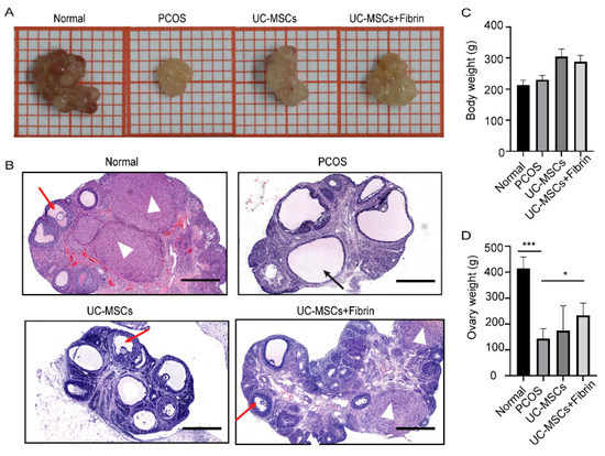 Comparison between ovary size and follicular morphology after implantation. (A) A representative ovary from various groups showing relative ovary size. (B) Ovarian and follicular morphology in various groups were examined by haematoxylin and eosin (H&E) staining. Ovaries with thicker granular layer and a higher number of cells in the corpus luteum were assessed in the normal and UC-MSCs + fibrin group. Black arrow: cystic follicle with fewer granules, red arrow: follicle with more granules, white triangle: corpus luteum (scale bar, 500 μm). (C) Mean body weight did not significantly differ among all groups. (D) Ovary weight significantly differed between the PCOS and normal groups (*** p < 0.001) and between PCOS and UC-MSCs + fibrin groups (* p < 0.5).