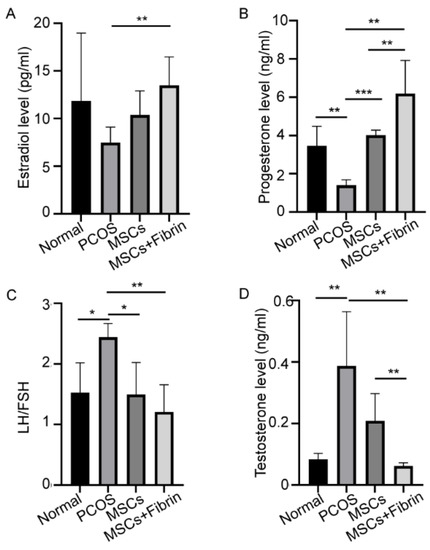 Treatment effect of UC-MSCs and UC-MSCs + fibrin on hormonal levels. (A) Levels of estradiol, (B) progesterone, (C) LH/FSH, and (D) testosterone (* p < 0.5, ** p < 0.01, *** p < 0.001).