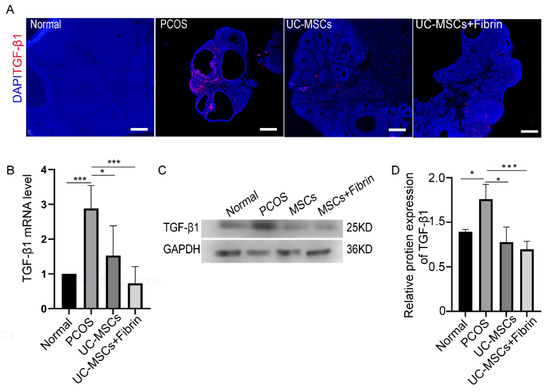 There is an increasing evidence that TGF-β plays a critical role in the development of PCOS. Based on this concept, we investigated TGF-β1 expression levels in our experimental groups by immunofluorescence staining. Notably higher TGF-β1 expression levels were observed in PCOS rats compared to the other groups (Figure 6A). However, the UC-MSCs and UC-MSCs + fibrin treatments reduced TGF-β1 expression levels comparable to the control rats after two weeks. To confirm this result, we further investigated TGF-β1 RNA and protein expression levels in the study groups. As expected, UC-MSCs treatment restored TGF-β1 RNA and protein expression levels comparable to the control group, suggesting that UC-MSCs can restore TGF-β1 expression in PCOS rats (Figure 6B–D).