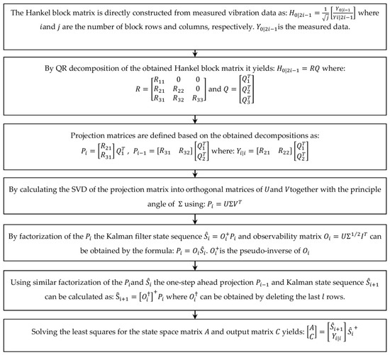 Classical covariance-based subspace algorithms [67,68,69] took advantage of using output data to calculate covariance. To deal with output-only measurement, Peeters and De Roeck [33] used covariance between outputs and a reference outputs for health monitoring of ambient excited civil structures. The proposed SSI-COV method used correlation functions for modal identification. In this method, the response signal of the applied ambient excitation is considered as Gaussian white noise, equal to the covariance of the response signal. The methodology of SSI-COV is provided in Figure 2.