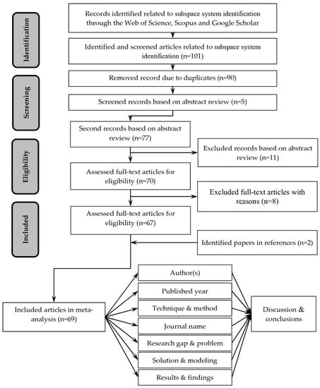 In the final step of our methodology, finally 69 articles were reviewed and summarized. Furthermore, all articles were reviewed based on various criteria such as the used technique and method, research gap and results and findings. We believe that, the reviewing, and classifying of articles can help to extract valuable and important information. Consequently, several recommendations were given for future studies. It is noteworthy that the difficult part during the accomplishment of the PRISMA method was to extract the implicit methodology in abstracts and the context of the selected articles. Hence, in order to provide sufficient information and unbiased decisions regarding the approach applied in the analysis, in most cases, the full manuscript was searched. The authors believe that this review could help the readers to find the most relevant and appropriate published studies regarding subspace system identification.