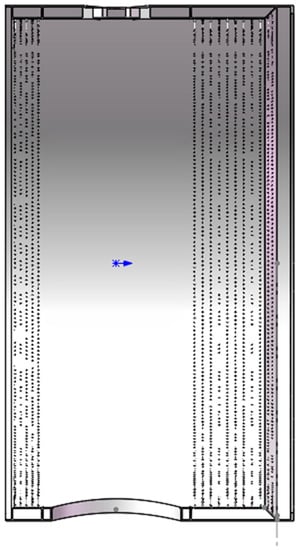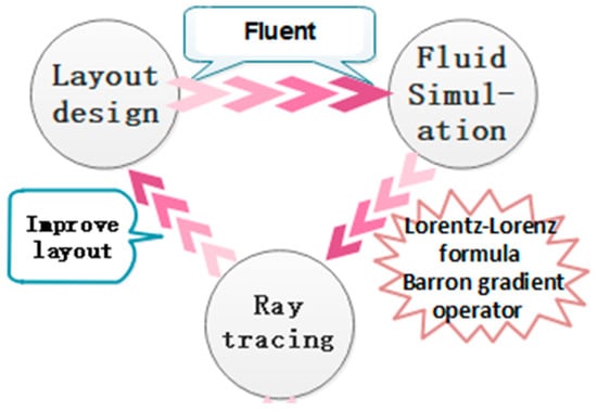 To verify the influence of the flow field on the beam quality in a beam expanding system, a typical Cassegrain reflection system with a diameter of 850 mm was considered as the research object. The structure is shown in Figure 1. The dissipation velocity of turbulence can be greatly increased by directly stimulating the turbulence at a small scale [,,], so the large-scale intake holes are replaced by a matrix of small-scale holes to increase the dissipation velocity in this work. In order to determine the ideal intake layout, we designed the simulation process shown in Figure 2. According to the simulation process, the layout of the intake holes should be designed first. Computational fluid dynamics (CFD) was used to simulate the flow field to obtain the flow field distribution. After obtaining the flow field distribution, the ray tracing method mentioned in Section 2.2 was used to perform ray tracing in the non-uniform refractive index medium. Finally, the flow field distribution and wavefront data were used as the references to improve the structure to obtain a better intake layout. Through a preliminary simulation analysis, it was found that when the mass flow rate and opening rate are fixed, the flow field in the beam expanding system improves significantly with an increase in the number of rows of air inlet holes and in the number of air inlets per row. For an air intake system with one row consisting of 18 holes, the variation of root mean square (RMS) of the wavefront aberration of a beam passing through the beam expanding system is 0.32 nm. When the number of air inlet vents is increased to 36, the RMS value of a beam passing through the system is 0.26 nm. When the air intake layout is expanded from a single row of holes to a double row with 18 holes in each row, the RMS value is 0.25 nm. With an increase in the number of air inlets per row and in the number of rows in the intake system, the influence of the flow field in the beam expanding system on the beam quality gradually weakens. Therefore, we preliminarily designed intake system layouts consisting of 4, 8, and 16 rows with 90 holes per row (see Table 1) and carried out corresponding numerical simulations. Since the existing equipment can provide a flow of only 100 g of gas per second, the mass flow rate was controlled to be 100 g per second during the processes of design, simulation, and experiment.