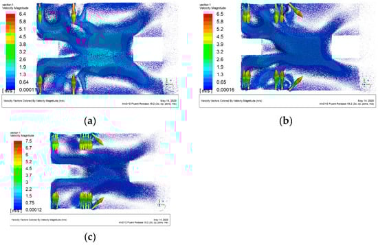 Velocity vector diagrams of the flow field in the beam expanding system: (a) velocity vector diagram for plan A; (b) velocity vector diagram for plan B; (c) velocity vector diagram for plan C.