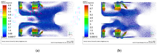 Velocity vector diagrams of the flow field in the beam expanding system for plans D and E: (a) velocity vector diagram for plan D; (b) velocity vector diagram for plan E.