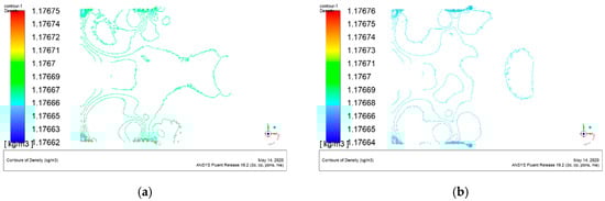 Contour maps of the fluid density in the beam expanding system for plans D and E: (a) contour map for plan D; (b) contour map for plan E.