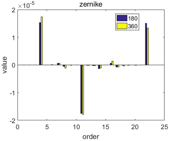 Below, we analyse the last three plans from the perspective of the wavefront aberration. Following the ray tracing process described in Section 2.2 above, we conducted ray tracing analyses of the optical paths in the beam expanding system. The PV (peak-to-valley) and RMS of wavefront aberration under these three plans are listed in Table 4. By comparing the wavefront aberrations of a beam passing through the beam expanding system, we can clearly see that plan D is significantly superior to plan C. This finding indicates that when the number of holes per row is 180, the flow state in the beam expanding system is better than it is with 90 holes per row. By comparing plan D with plan E, we can see that when the number of holes in a single row is further increased, and the further improvement in the wavefront aberration is significantly weaker. Thus, an increase in the number of holes per row from 180 to 360 has little effect on the wavefront aberration. However, from Figure 8, we can clearly see that the 4th-order Zernike coefficient under plan E is increased compared with that under plan D, whereas the 22nd-order coefficient is significantly decreased. These findings indicate that when the number of holes per row is increased from 180 to 360, the low-frequency components of the wavefront aberration increase in strength, while the high-frequency components are reduced, which is helpful for facilitating other methods of correction to improve the quality of the beam.