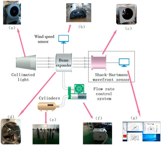 Experimental platform and equipment: (a) collimator; (b) wind speed sensor; (c) Shack–Hartmann wavefront sensor; (d) beam expander; (e) cylinders; (f) flow rate control system; (g) screen.