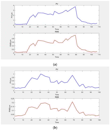 The results of another measurement performed after eliminating the tilt in the experimental set-up are shown in Figure 11b. Because of the processing errors and unevenness of inflation, a larger tilt is introduced into the wavefront aberration. Since the tilt can be eliminated by adjusting the mirror, we no longer consider the tilt in the calculation process. As seen from this figure, the results were consistent with the trend observed in Figure 11a. The wavefront aberration was stable at approximately  before the gas flow was started. When gas intake started at 12 s, the wavefront aberration rose rapidly, and the RMS value finally stabilized at approximately . When the gas supply was stopped at 62 s, the wavefront aberration initially rose to  and then quickly returned to the pre-flow level.