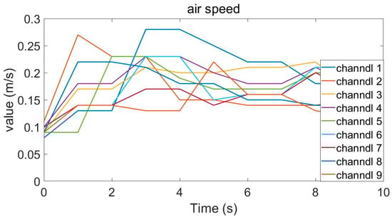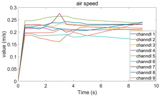 During the experiment, we also used a series of wind speed sensor to monitor the changes in wind speed. The results are shown in Figure 12. When the inflation starts, the airflow speed rises rapidly, and the velocity of the fluid in the system can reach the level of the platform within a short time. Comparing Figure 12 and Figure 13, it is found that the speed increase at the beginning of the experiment is slower than the simulation. The reason for this phenomenon is that it takes time for the pipeline pressure to increase. Nonetheless, the tendency and the final results of the two are consistent.
