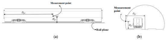 Schematic of measuring points locations: (a) on the middle car; (b) on the inner wall of the tunnel; (c) cross sections along the tunnel. Dimensions are in [m].