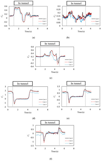 The peak to peak values of the aerodynamic coefficients are listed in Table 4. The largest changes of are observed in Case 1. The reason for this can be attributed to the positive peak, which for Case 1 it has the highest value (Figure 11a–c). The largest changes of and are shown at Case 2, Figure 11d–i. The head car is affected more as compared to the middle and tail cars, when the train entering the tunnel. The train exiting the tunnel results in large changes in and values in Case 2, compared to other two cases, shown in Figure 11a–c and g–i. Figure 11c shows that Case 2 causes a strong negative peak at moment when the train leaving the tunnel. The coefficient at the exit of the tunnel was found to change more in Case 1 than in the other two cases, showing that maximum value of in Case 1 is greater than that of two other cases (Figure 11d–f). Similarly, , the changes of for the Case 1 and 2 are larger than Case 3 because their higher values of the occurs in both two open-air regions, as shown in Figure 11j–l.
