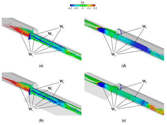 Figure 16d–f show the instants when the train is leaving the tunnel. Here, several waves are generated from the bogies (W4) and windshields (W5). However, these waves are smaller and denser than W1 and W2. The flow structures around the head car are similar, and the biggest difference among the three cases is the flow around the tail car and in the wake. The pressure of the flow structures around the tail car is lower in Case 1, as shown in Figure 16d, while the pressure in this region increases (although still negative) in Case 2, as seen in Figure 16e, and approaches 0 in Case 3 (Figure 16f). It shows that a smaller change of the flow pressure around the train is observed in Case 3.