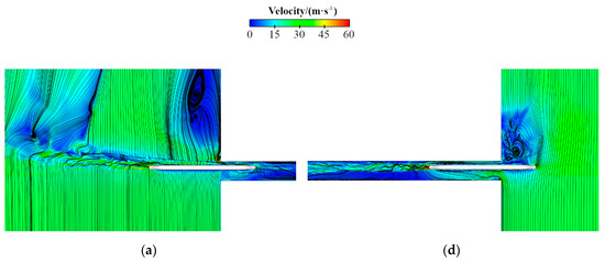 Figure 17 shows the streamlines in the horizontal plane at 1.7 m above the rail top. Two time-instances are visualized, the first one represents the moment the train is entering the tunnel, while the second, shows the exit instant. As seen in Figure 17a–c, due to the effect of the crosswind, a wake and a trailing vortex roll up from the separation on the roof of the train when the train is entering the tunnel and some parts of the train are still in the open-air region 1, which shows a reasonable agreement with the investigation of Yang [18]. Due to the blocking of the tunnel wall, the crosswind will not affect the inside of the tunnel, which means the crosswind only impinges the outside part of the train and provides a distinct lateral force on this part. Therefore, a shear force between the inside and outside parts is formed. Those regions with low and high velocities are easily to be distinguished. Two low speed regions are observed on the leeward side of the train in the region close to the junction and in the far wake. Another observation is that the two low speed zones are smaller in Case 3 than in the other two cases.
