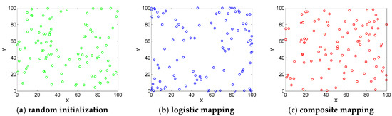 Figure 1 presents the initial distribution of 100 search agents produced by random initialization, logistic mapping, and composite mapping in 100 × 100 area, respectively. It can be observed that the initialization based on the proposed composite mapping achieved a better distribution effect.