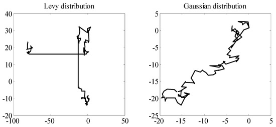 The random step generates by the Lévy flight strategy obeys the Lévy distribution. The levy distribution is a type of fat-tailed distribution, and its tail is wider than Gaussian distribution. Figure 2 shows 100 consecutive steps based on Lévy distribution and Gaussian distribution. It can be seen that Lévy flights can generate a large step occasionally, which means a stronger disturbance effect. However, with respect to Gaussian distribution, its steps are always small.
