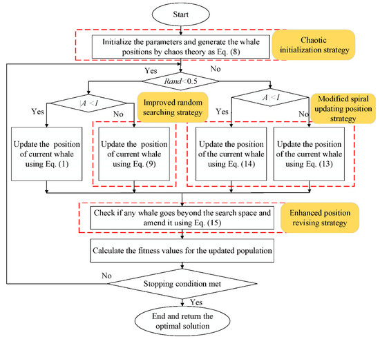 The main framework of the proposed MSWOA method is illustrated in Figure 3. First, the whale swarm was initialized by the chaotic initialization strategy. Thus, the initial whales could be evenly distributed in the search domain. Then, an improved random searching strategy and a modified spiral updating position strategy were introduced to make up the drawbacks of WOA and balance exploitation and exploration. Additionally, the enhanced position revising mechanism was adopted to make the whale population further explore the search space and yields a better MSWOA.