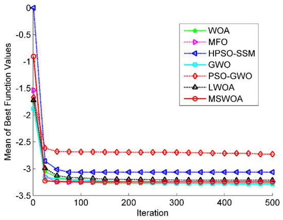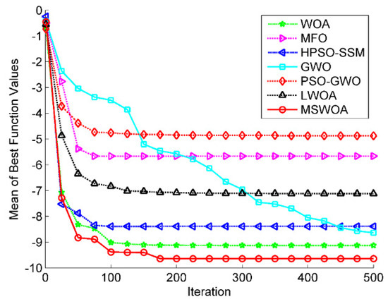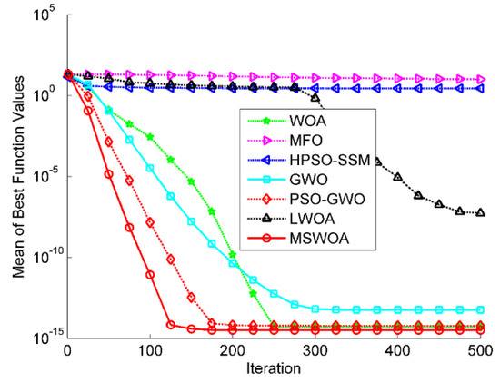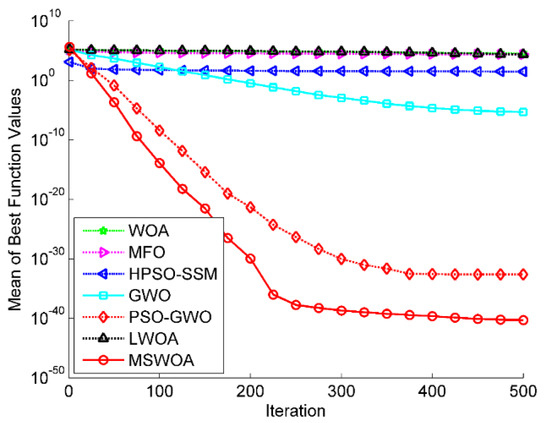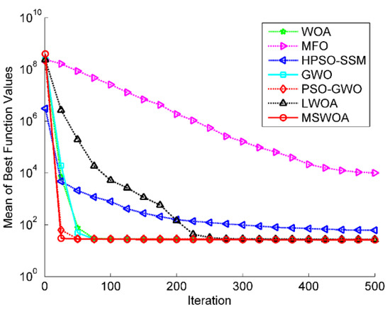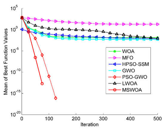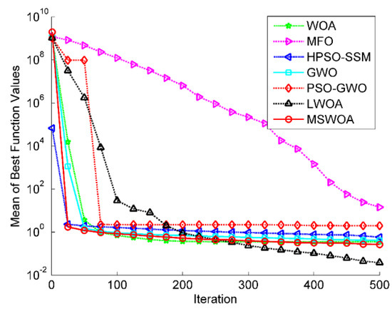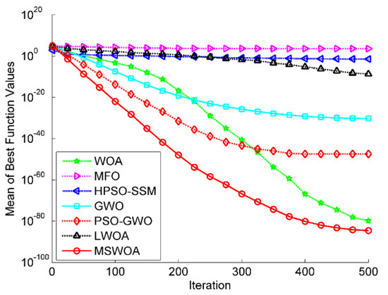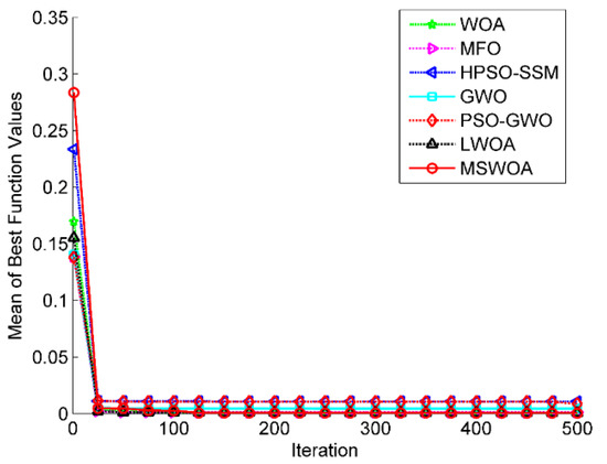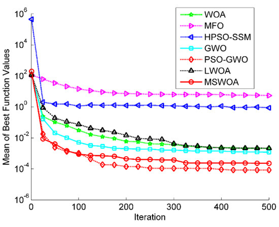 In this subsection, comparative numerical optimization experiments were conducted among the WOA [26], MFO [11], HPSO-SSM [48], GWO [10], PSO-GWO [49], LWOA [40], and MSWOA. Table 3 presents the mean and S.D. of the algorithms. Moreover, from Figure 4, Figure 5, Figure 6, Figure 7, Figure 8, Figure 9, Figure 10, Figure 11, Figure 12 and Figure 13, we can see the convergence curves for these seven metaheuristic swarm optimization algorithms.