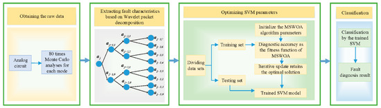 As electronic systems have found their way into military, medical, aerospace, and other fields, individuals put forward stricter requirements on electronic systems in terms of stability, safety, and maintainability [12,13,14,15]. Research on fault diagnosis methods of circuit systems is an effective way to increase their reliability. When an electronic system fails, it should be able to immediately and effectively identify faults to avoid more severe situations. Therefore, circuit fault diagnosis evaluation has become the focus of intense research in the field of circuit design [16,17]. Recently, numerous circuit diagnosis methods have been proposed. Among them, support vector machine (SVM) is an excellent method on account of its small sample learning ability and short training time [18,19,20]. Thus, SVM is frequently applied to analog circuit fault diagnosis. However, an emerging problem is how to select the parameters of SVM, which have high impacts on classification performance. Against this background, many researchers turned their eyes to SIOAs.