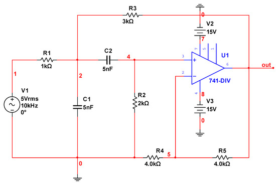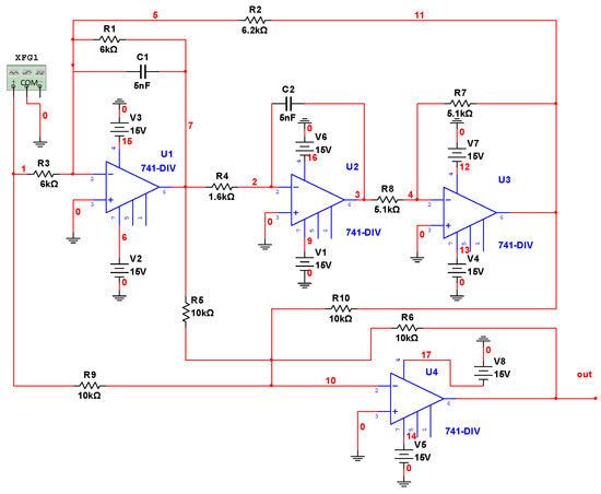 The second group of fault diagnosis experiments was conducted on the four-op-amp biquad high-pass filter circuit, as shown in Figure 19. The parameters of which were set as follows: the value of resistor tolerance in the circuit was 5%, while the capacitance tolerance was rated to 10%. In addition, we applied a sinusoidal excitation signal (amplitude 10 Vrms, frequency 2 kHz) to this circuit, and collect the voltage signal outputs from the out node.