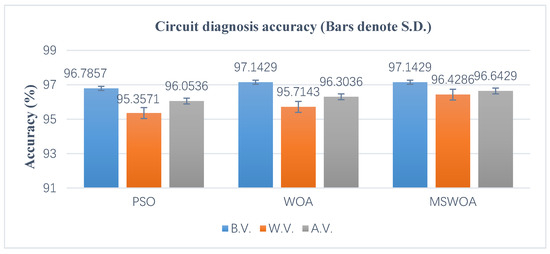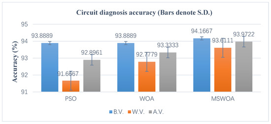 Similar to the first group of analog circuit fault diagnosis experiment described in the previous subsection, in this part, the MSWOA algorithm was compared with PSO and WOA by optimizing the SVM parameters for fault diagnosis. The initialization parameters settings for the three metaheuristic optimization algorithms were identical to the first group, i.e., the swarm size was 20, and the maximum steps of iterations were 100. To avoid the contingency of one experimental result, we performed 20 executions of each algorithm, and the statistics are presented in Figure 20, where the B.V., W.V., and A.V. mean the best value, the worst value, and the average value of the twenty experimental results, respectively.
