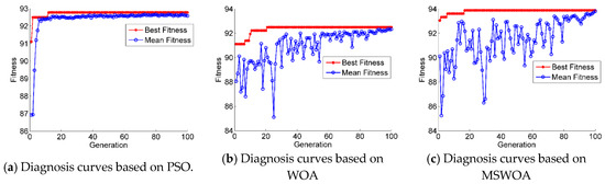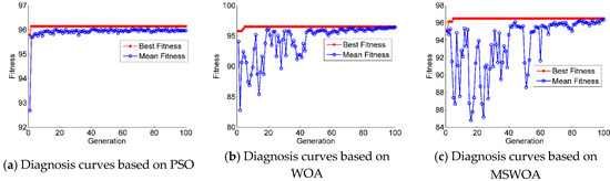 Figure 18 shows the diagnostic accuracy curves of SVM optimized by PSO, WOA, and MSWOA, respectively. In each of those three figures, the mean fitness curve and the best fitness curve were obtained by the whole population in one optimization process (100 iterations). From those figures, we can conclude that the SVM optimized by the proposed MSWOA had the best performances in accuracy and speed.