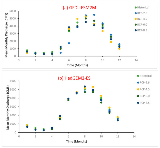 The mean monthly streamflow for the historical period and future period under all four emission scenarios of each climate model are presented in Figure 6a–e. Future flow projections were compared for the basin outlet. The observed mean monthly discharge at Qianjiang hydrological station (considered as the basin outlet) was 2238.27 m3/s. The GFDL-ESM2M historical mean monthly discharge, presented in Figure 6a, was 2433.94 m3/s, while the projected mean monthly discharge under RCP-2.6 was 2267.93 m3/s; for RCP-4.5, 2231.61 m3/s; for RCP-6.0, 2306.45 m3/s; and for RCP-8.5, 2203.219 m3/s. The HadGEM2-ES historical mean monthly discharge, presented in Figure 6b, was 2560.865 m3/s, while the projected mean monthly discharge for RCP-2.6 was 2458.32 m3/s; for RCP-4.5, 2639.80 m3/s; for RCP-6.0, 2350.47 m3/s; and for RCP-8.5, 2516.08 m3/s. The IPSL-CM5A-LR historical mean monthly discharge, presented in Figure 6c, was 2546.93 m3/s, while the projected mean monthly discharge for RCP-2.6 was 2172.80 m3/s; for RCP-4.5, 2204.61 m3/s; for RCP-6.0, 2268.96 m3/s; and for RCP-8.5, 1911.05 m3/s. The MIROC-ESM-CHEM historical mean monthly discharge, presented in Figure 6d, was 2574.14 m3/s, while the projected mean monthly discharge for RCP-2.6 was 2268.74 m3/s; for RCP-4.5, 2250.32 m3/s; for RCP-6.0, 2355.68 m3/s; and for RCP-8.5, 2241.57 m3/s. The NorESM1-M historical mean monthly discharge, presented in Figure 6e, was 2546.93 m3/s, while the projected mean monthly discharge for RCP-2.6 was 2791.36 m3/s; for RCP-4.5, 2725.03 m3/s; for RCP-6.0, 2635.87 m3/s; and for RCP-8.5, 2692.98 m3/s. The five global climate models had similar patterns in pre-monsoon discharge trends, followed by abrupt peaks during monsoon and medium peaks post-monsoon. February, March, and April had the lowest peaks (i.e., lower than 1000 cm3/s).