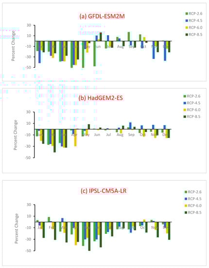Percent change of mean monthly discharge for the future period under four emission scenarios for each global climate model: (a) GFDL-ESM2M, (b) HadGEM2-ES, (c) IPSL-CM5A-LR, (d) MIROC-ESM-CHEM, and (e) NorESM1-M.