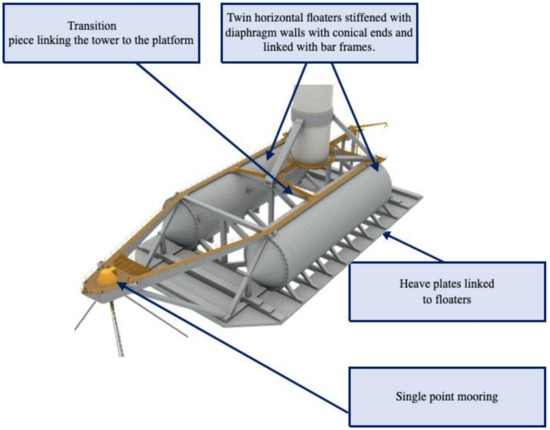 - Twin horizontal floaters stiffened with diaphragm walls with conical ends and linked with bar frames.