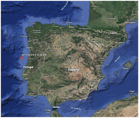 The location selected for the case of study, whose main characteristics are shown in Table 2, is Figueira da Foz (west coast of Portugal, Iberian Peninsula) [35,36] (see Figure 5).