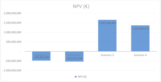 Nevertheless, the Net Present Value (NPV) varies depending on the electric tariff and the capital cost taken into account. Results of the farm considered analyzing the SATH® platform are shown in Figure 7. Scenario 2 has the worst value for NPV (−531 M€), followed by Scenario 1 (−479 M€). However, Scenarios 3 and 4 have better values for NPV: 1657 M€ and 1365 M€, respectively. A project is economically feasible if its NPV is higher than zero. Therefore, regarding NPV Scenarios 1 and 2 are not economically feasible and Scenarios 3 and 4 are economically feasible because their value is higher than zero.