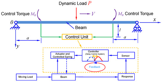In this study, we consider a dynamic beam structure subjected to the dynamic load P, which moves along the longitudinal direction of the beam with a velocity V and under active control by a servomechanism, as shown in Figure 1. The motion equation of the beam is shown as follows [9]: