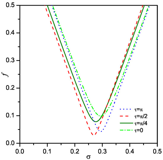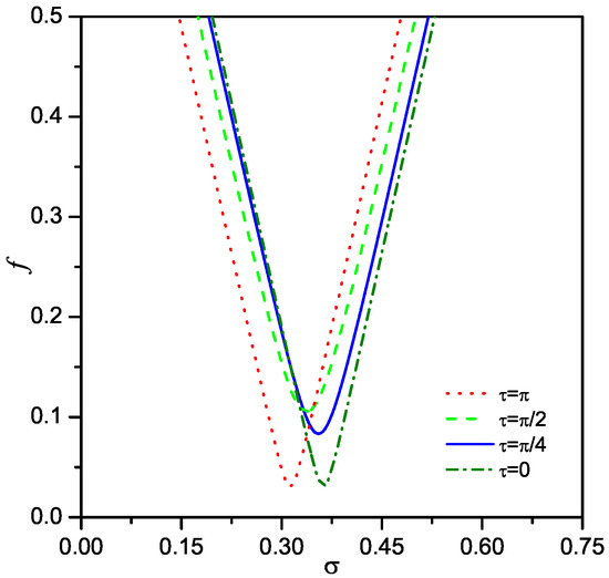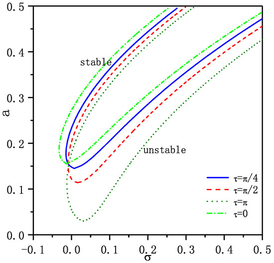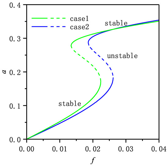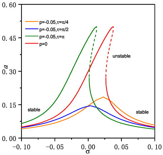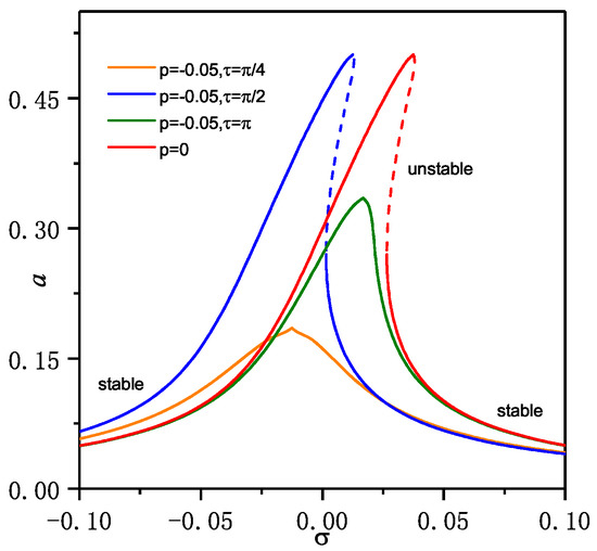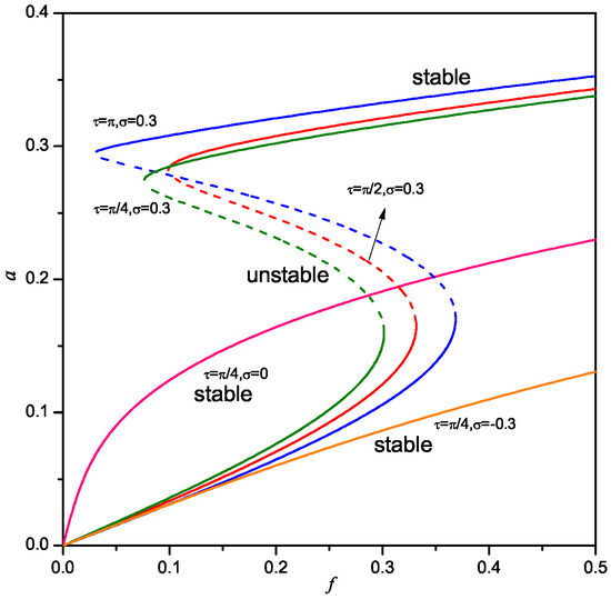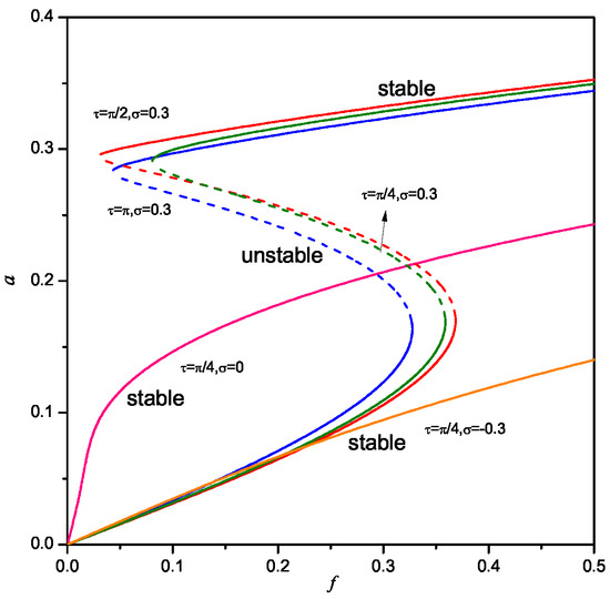 For a special case, the parameters are confirmed as . The frequency-response curves (a versus ) for the primary response are depicted in Figure 2. Selecting the control gain value , it can be seen from the frequency amplitude curve that by adjusting different time delay, a better control effect can be obtained, and the peak value of the response can be significantly reduced. Figure 3 shows the variation of the response amplitude with the excitation amplitude for several values of and . These curves were obtained directly from Equation (12). We note that, depending on the value of , some curves are multivalued while others are single-valued.