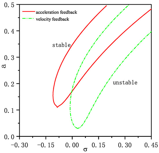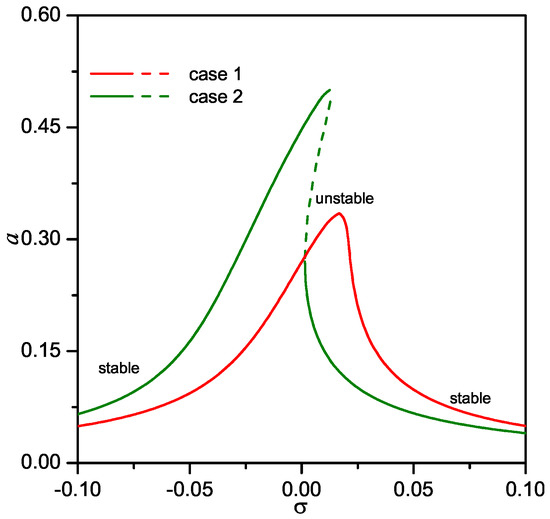 In this section, we study the nonlinear response of the beam under time-delayed acceleration feedback, i.e., . Similar to the derivation process in Section 3, the frequency response equation of primary resonance response are obtained as follows: