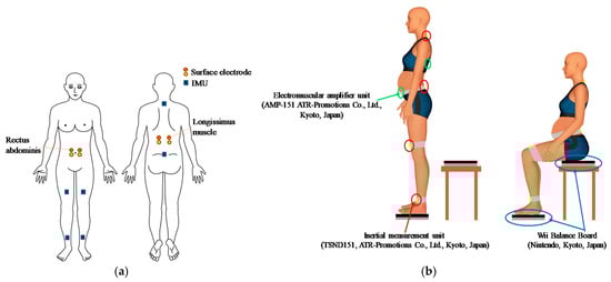 Experimental settings: (a) position of the inertial measurement units (IMUs) and surface electrodes; (b) experimental settings.
