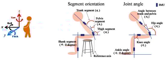 Signal processing of IMU data during STS motion analysis was performed using MATLAB Release 2016a (MathWorks, Release 2016a, Natick, MA, USA). The coordinate system in the experimental settings is shown in Figure 2. First, the segment orientation and joint angles of each segment were calculated as motion data using IMU data and the same protocol as our previous study [15]. The calculated orientations of body segments and joint angles are shown in Figure 2. The direction of the axis of each IMU was determined as the line of each segment.