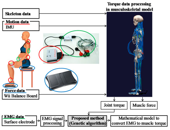 Muscle torque as an index of muscle load was calculated from obtained data in this study. An overview of the system used to estimate muscle torque is presented in Figure 3. For each trial, muscle torque was estimated by considering co-contraction activation using a GA according to the following process. The procedure for estimating RA and ES muscle torque is fundamentally the same as that in our previous study [15]. First, Equation (3) was used to estimate the muscle torque. The equation is a mathematical model proposed by Oyong and Jauw [29] that converts EMG signals to muscle torque: