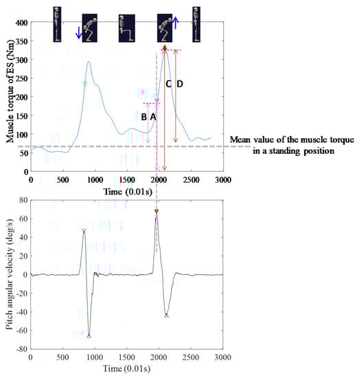 A universal evaluation index calculated from muscle torque during STS motion has not been established by previous research. Thus, the following indices were calculated to investigate the relationship between the motion features and muscle torque of the ES during STS motion in pregnant women (Figure 4). First, the value of the ES muscle torque (MT) during STS motion at the maximum peak of the angular velocity in the sagittal plane of the lower trunk segment (MP) was detected and termed MT-MP (Figure 4, point A). Then, the difference in muscle torque at MP and the standing position (DMT-MP-stand) was also calculated (Figure 4, point B) to remove the individual differences in muscle torque in the standing position. The maximum peak of the ES muscle torque during STS motion (Max-MT) was also detected (Figure 4, point C), and the difference between the value of ES muscle torque during STS motion and the standing position (DMT-Max-stand) was calculated (Figure 4, point D). Furthermore, the root mean square (RMS-MT), which is commonly used to express the effective value of a waveform, was calculated using the ES muscle torque data for each motion by Equation (7). All relevant indices were calculated for each trial and each participant.