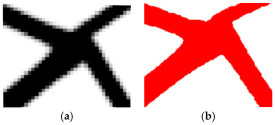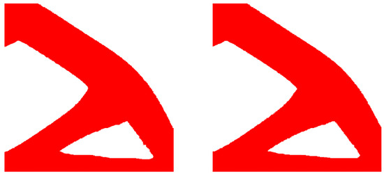 For these calculations, the von Neumann neighborhood was chosen, but the implementation of the Moore one was also tested. According to the results of this study, the choice of the neighborhood type had no significant influence on the final results of the topology optimization for the examples discussed in this paper. Below (Figure 11), the final topologies found for von Neumann (left) and Moore (right) neighborhoods are presented. The final values of the compliance for both types were the same, i.e., 2.149·10−4 Nm.