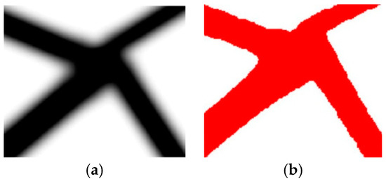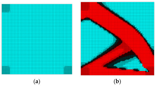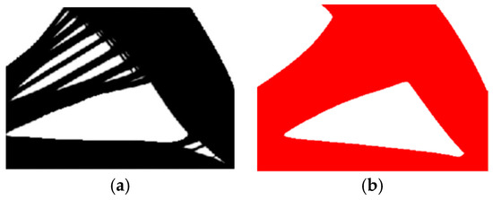 The appearance of thin and slender parts of structural topology in the case of a fine mesh has to be controlled by filtering techniques: (a) example of a fine mesh without filtering; (b) example of a fine mesh with filtering.