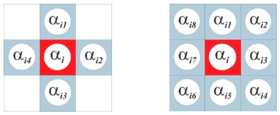 Updating the density of a central cell is based on information gathered among neighboring rectangular cells. The von Neumann (left) and Moore (right) neighborhood.