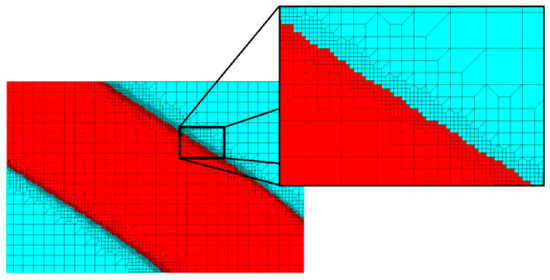 The automatic mesh refinement of selected elements proceeds in order to get the resulting element edge length equal to approximately 0.5 of the original element edge length. The mesh created is free from so-called hanging nodes, because the neighboring cells of the refined element are affected (split) in order to preserve the transition between elements. In the automatic refinement of the meshing procedure, the depth of refinement is equal to one element outward of the selected cell, and introducing triangular elements is forbidden; these options can be defined in ANSYS. An illustration of the mesh refinement concept is presented in detail in Figure 7.