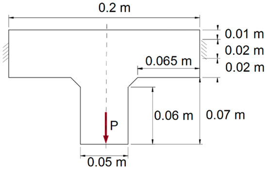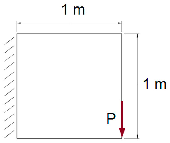 As an introductory example of the implementation of the proposed idea, a plain elastic square structure, fixed along the left edge and loaded as presented in Figure 8, was chosen. The Young modulus and the Poisson ratio were E = 2 × 1011 Pa and ν = 0.3, respectively. A volume fraction equal to 0.5 was implemented. A concentrated force P equal to 1000 N was applied.